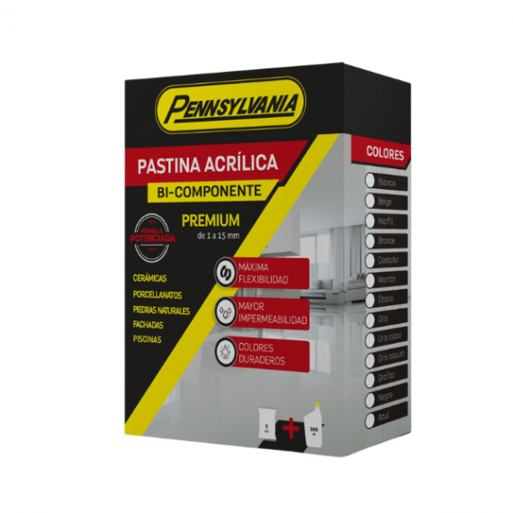 Descripción: Pastina Acrílica Pennsylvania es un mortero Cementicio Bi-componente alta gama para relleno de juntas. Disponible en 13 colores, se puede usar con todo tipo de pieza cerámica (alta y media absorción), porcellanatos de baja absorción, mármoles, granitos y piedras naturales.